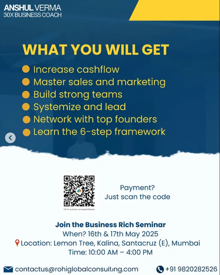 Anshul Verma is the driving force behind Rohi Global Consulting, a leading business consulting firm dedicated to transforming MSMEs and SMEs. With over two decades of expertise, Anshul empowers organizations to scale smartly through tailored programs focused on business mastery, leadership development, employee engagement, and strategic growth. Known as the 30X Business Coach, he blends proven frameworks with practical insight, guiding leaders to build sustainable success and high-performing teams.